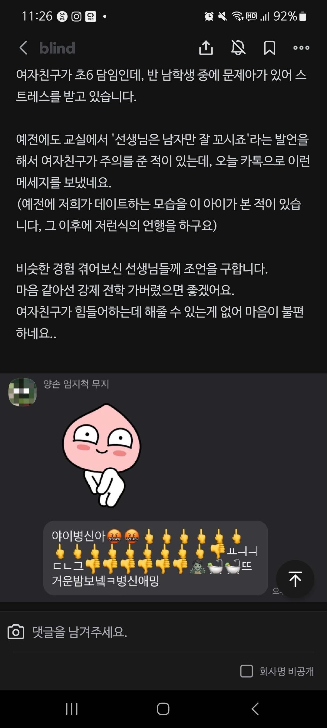 안녕하세요여자친구가 초6 담임인데, 반 남학생 중에 문제아가 있어 스트레스를 받고 있습니다.예전에도 교실에서 '선생님은 남자만 잘 꼬시죠'라는 발언을 해서 여자친구가 주의를 준 적이 있