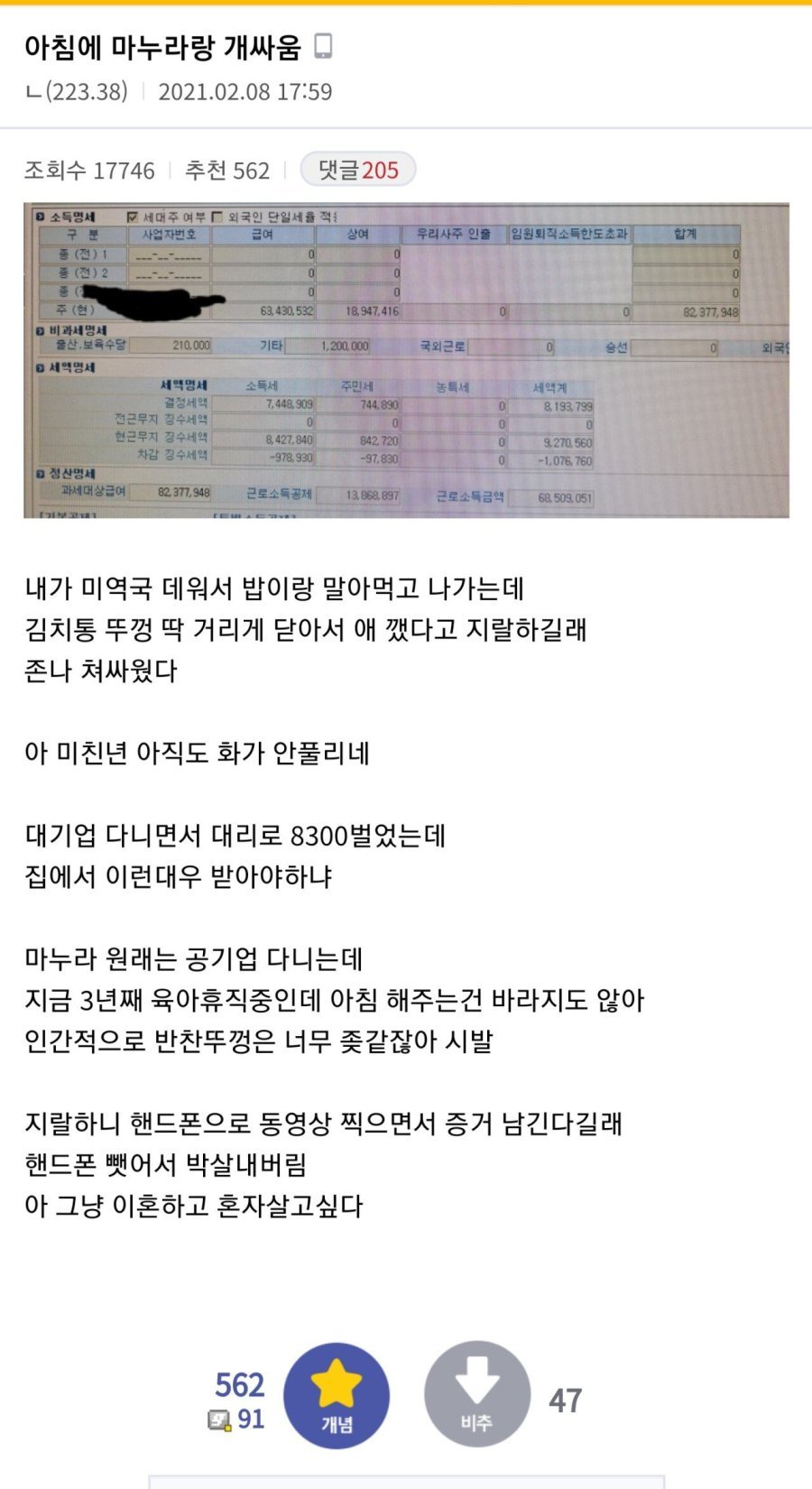 내가 미역국 데워서 밥이랑 말아먹고 나가는데김치통 뚜껑 딱 거리게 닫아서 애 깼다고 지랄하길래존나 쳐싸웠다아 미친년 아직도 화가 안풀리네대기업 다니면서 대리로 8300벌었는데집에서 이